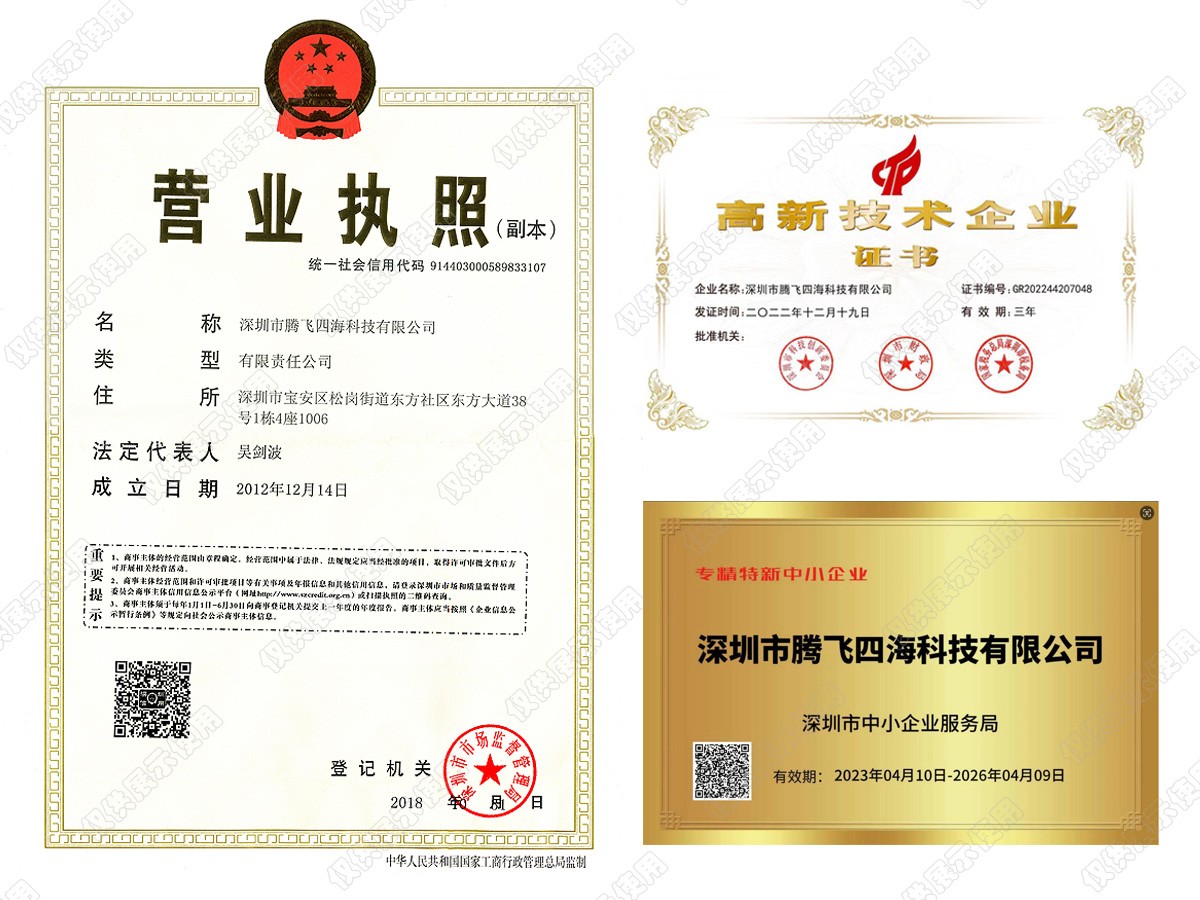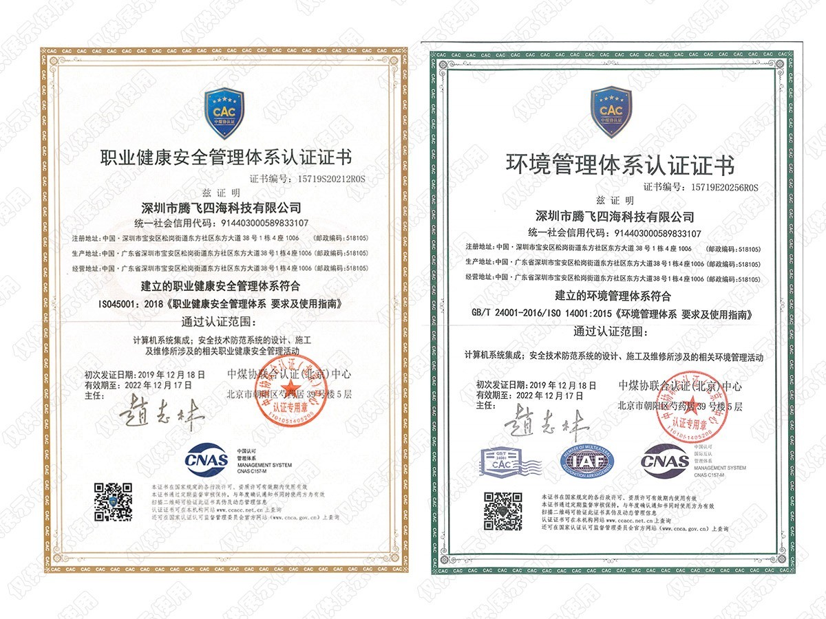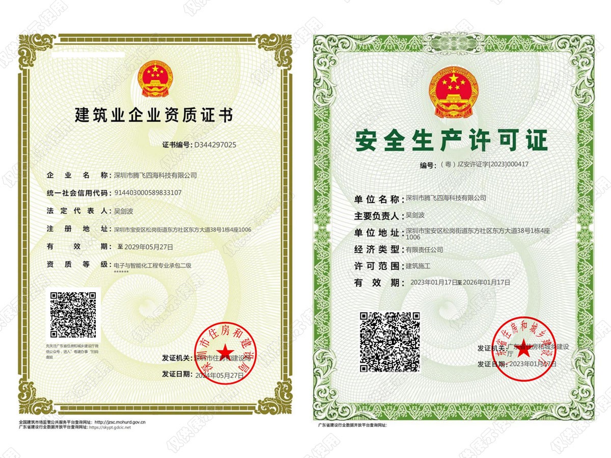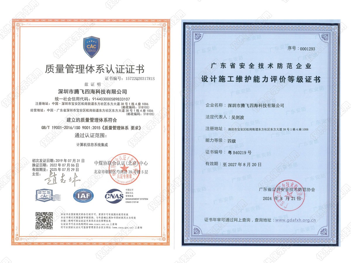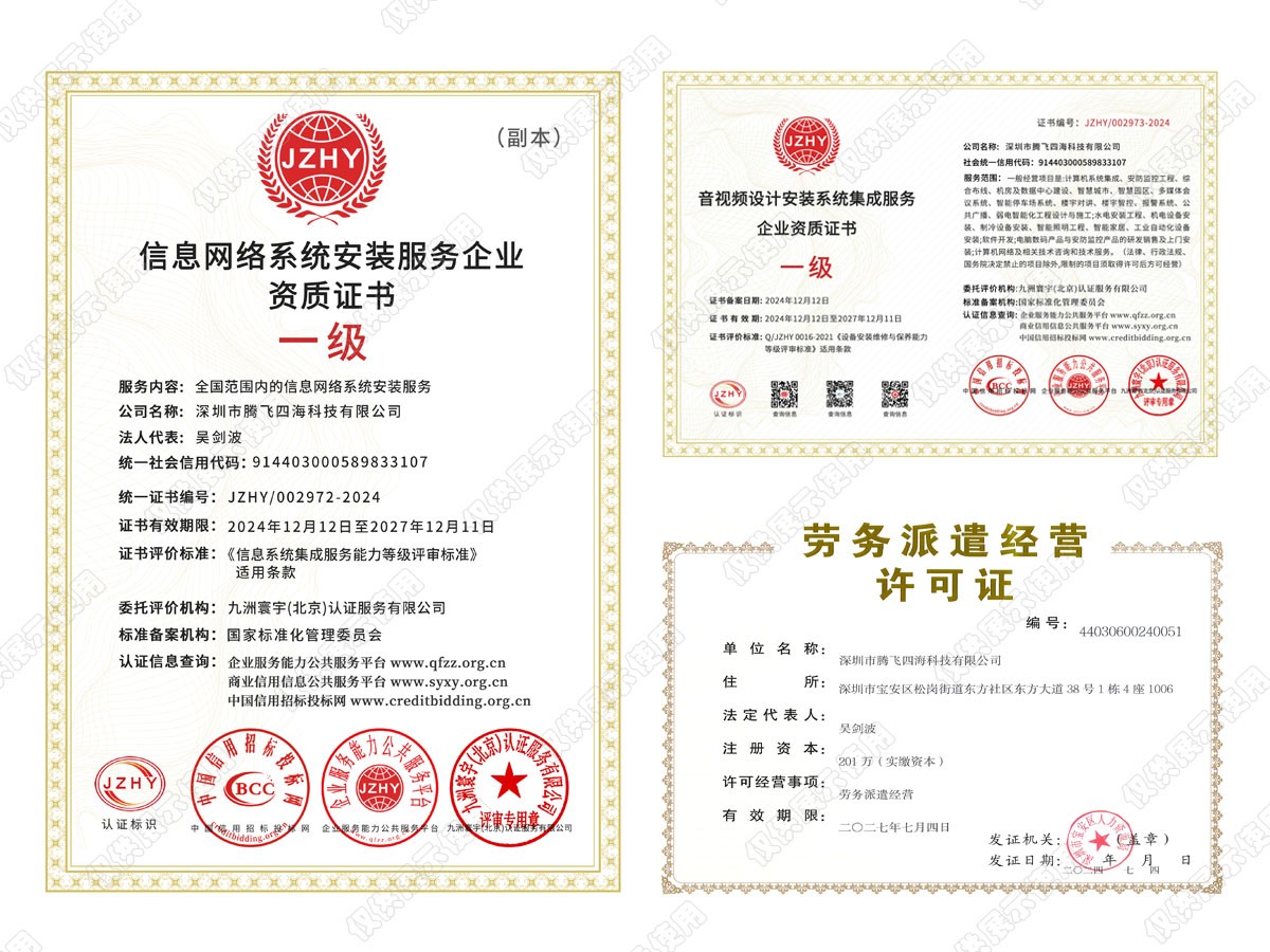 深圳市騰飛四??萍加邢薰緦WF(xiàn)代化企業(yè)信息建設(shè),爭做國內(nèi)互聯(lián)網(wǎng)與安防領(lǐng)域的領(lǐng)導(dǎo)者。作為一家擁有自主知識(shí)產(chǎn)權(quán)的國家高新技術(shù)企業(yè),在成立之初便堅(jiān)持從用戶的實(shí)際需求出發(fā),以質(zhì)量求發(fā)展,以信譽(yù)求生存。歷經(jīng)15年的風(fēng)雨路程,如今,我們已榮獲電子與智能化專業(yè)承包資質(zhì)、廣東省公安廳安防資質(zhì)、安全生產(chǎn)許可證資質(zhì)、計(jì)算機(jī)信息系統(tǒng)集成等多項(xiàng)資質(zhì)。截止目前公司已通過:ISO9001質(zhì)量管理體系認(rèn)證,ISO14001環(huán)境管理體系和ISO45001職業(yè)健康安全管理體系;榮獲AAA資信認(rèn)證、實(shí)用新型專利證書、計(jì)算機(jī)軟件著作權(quán)登記證書。公司現(xiàn)為深圳市安防協(xié)會(huì)理事單位,深圳市文明誠信企業(yè),廣東省“守合同重信用”企業(yè)、深圳市政府采購中心供應(yīng)商等多個(gè)榮譽(yù)證書。